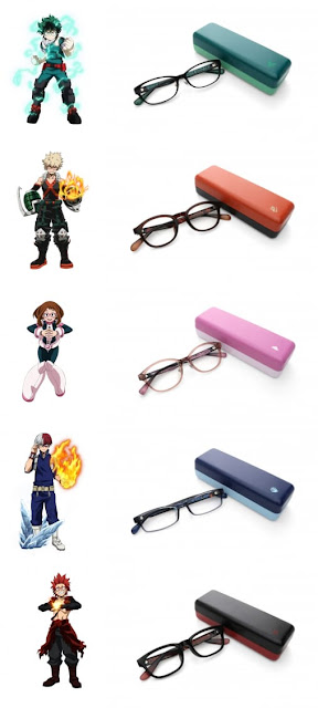 Los primeros modelos disponibles están inspirados en los héroes de la clase A-1Izuku MidoriyaKatsuki BakugoShoto TodorokiOchaco Urara, y Eijiro Kirishima. Todos los anteojos cuentan con pequeñas ilustraciones de los personajes, además de incluir un estuche personalizado para cada modelo de lentes.